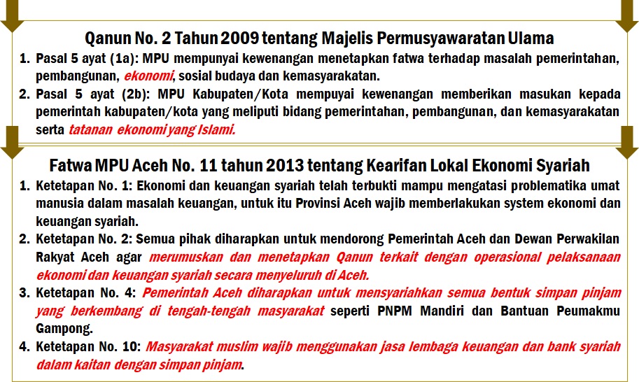 Dalam kutipan beberapa pasal pada perundang-undangan di atas, kita melihat bahwa ulama memiliki fungsi strategis dalam memberikan rekomendasi terkait penetapan fatwa terkait perekonomian di Aceh. Pertanyaannya: mungkinkah ulama Aceh membiarkan umatnya terjebak pada perekonomian ribawi tanpa upaya apa pun? Tentu tidak. Majelis Permusyawaratan Ulama Aceh telah memberikan ketetapan-ketetapan yang jelas terkait urgensi implementasi syariah Islam secara menyeluruh di Aceh sejak tahun 2013. Pada awal Oktober tahun 2018, Lokakarya MPU Aceh juga mengangkat tema “Koperasi Syariah, Antisipasi Riba dan Rentenir”, dengan ketetapan yang sejalan dengan semangat melaksanakan ekonomi dan keuangan syariah secara menyeluruh melalui penerbitan Qanun yang disusun oleh Pemerintah Aceh dan Dewan Perwakilan Rakyat Aceh.