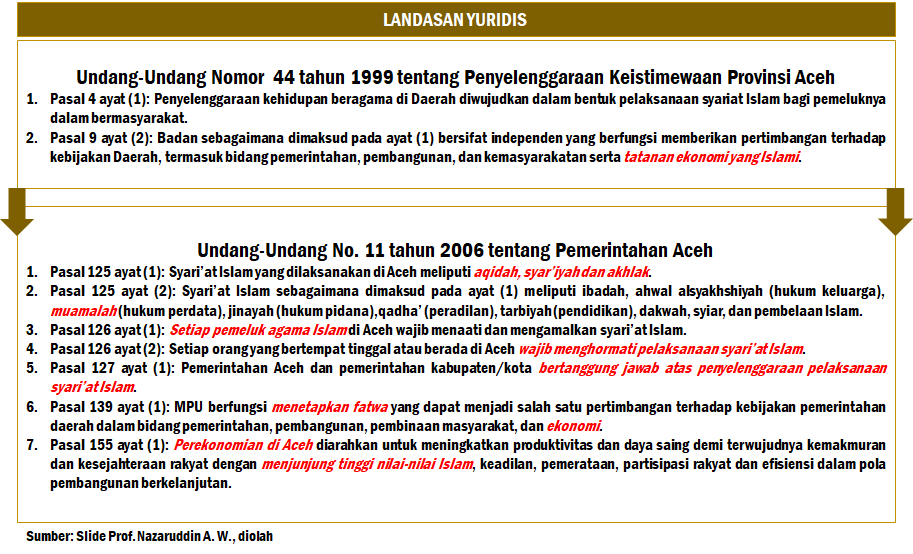 Di Aceh, Majelis Permusyawaratan Ulama (MPU) telah mengeluarkan Fatwa No. 11 tahun 2013 tentang Kearifan Lokal Ekonomi Syariah, dan kemudian diperkuat dengan Qanun No. 8 Tahun 2014 tentang Pokok-Pokok Syariat Islam yang mengharapkan pelaksanaan bidang muamalah di Aceh bebas dari maisir (judi), gharar (penipuan), tadlis (samar-samar), spekulasi, monopoli dan riba. Artinya, di tahun 2020 ini, sebenarnya kita sudah terlambat sangat lama untuk mencoba menerapkan prinsip syariah Islam pada bidang ekonomi dan keuangan. Apalagi apabila rujukan yang kita pakai adalah Al Quran, atau hadis Nabi, mungkin kita sudah terlambat ribuan tahun untuk segera memulai ikhtiar menerapkan nilai Islam dalam bidang muamalah. Di sisi lain, Aceh sudah punya kesempatan untuk melahirkan dan menerapkan Qanun LKS segera setelah lahirnya Undang-Undang No. 44 tahun 1999 tentang Penyelenggaraan Keistimewaan Provinsi Aceh, atau setidaknya setelah lahirnya Undang-Undang No. 11 Tahun 2006 tentang Pemerintahan Aceh.