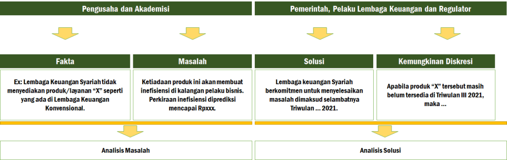Oleh karena itu, pengusaha dan akademisi harus duduk bareng, untuk melakukan analisis atas fakta dan masalah yang ada. Outputnya berupa “daftar inventarisasi masalah”. Kemudian, Pemerintah dan/atau regulator membahas setiap masalah yang ada dengan fokus pada 2 hal saja: bagaimana mencari solusinya, dan apa diskresi/dukungan khusus yang harus ditempuh untuk mendukung lahirnya solusi tersebut. Cara pikir ini kami ilustrasikan melalui gambar berikut: