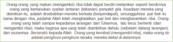 الَّذِينَ يَأْكُلُونَ الرِّبَا لَا يَقُومُونَ إِلَّا كَمَا يَقُومُ الَّذِي يَتَخَبَّطُهُ الشَّيْطَانُ مِنَ الْمَسِّ ۚ ذَٰلِكَ بِأَنَّهُمْ قَالُوا إِنَّمَا الْبَيْعُ مِثْلُ الرِّبَا ۗ وَأَحَلَّ اللَّهُ الْبَيْعَ وَحَرَّمَ الرِّبَا ۚ فَمَنْ جَاءَهُ مَوْعِظَةٌ مِنْ رَبِّهِ فَانْتَهَىٰ فَلَهُ مَا سَلَفَ وَأَمْرُهُ إِلَى اللَّهِ ۖ وَمَنْ عَادَ فَأُولَٰئِكَ أَصْحَابُ النَّارِ ۖ هُمْ فِيهَا خَالِدُونَ